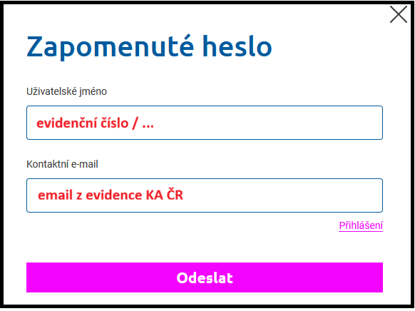 Pro obnovu hesla, prosím, klikněte na „Přihlásit“ a poté „zapomenuté heslo“ pod políčky pro přihlášení. Viz obrázek.